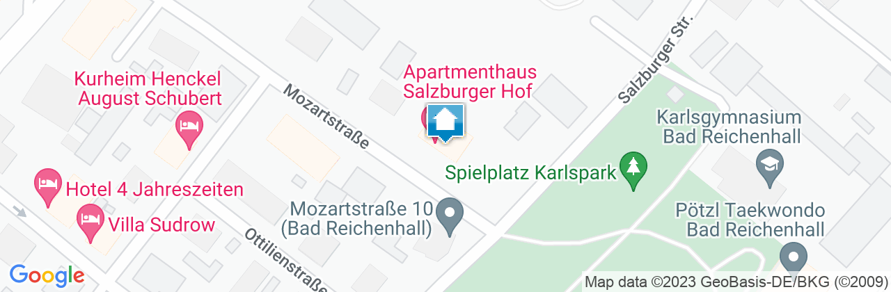 Das Apartmenthaus Salzburger Hof befindet sich mitten im Grünen aber dennoch in zentraler Lage. Der Karlspark mit seinem herrlichen alten Baumbestand liegt in direkter Nachbarschaft, der Kurgarten mit seinen wunderschönen Anpflanzungen und dem Gradierwerk sowie dem Königlichen Kurhaus ist etwa 350 m entfernt. Der Hauptbahnhof Bad Reichenhall liegt am anderen Ende der Mozartstraße (Distanz etwa 250 m). Ein Vollsortiment-Supermarkt, ein Discounter und eine Drogerie sind in 300 bis 600 m Entfernung erreichbar. Die Gaststätte Schwabenbräu ist etwa 150 m, der Beginn der Fußgängerzone etwa 350 m entfernt. Die Apartments wurden in den letzten Jahren (teil-)renoviert. Sie verfügen über eine moderne Küche und teilweise neue PVC-Böden bzw. Teppichböden. Sämtliche Apartments haben einen kleinen (2020 renovierten) überdachten Balkon mit Bergblick. Sie haben die Möglichkeit für eine zusätzliche Person ein 25 m² großes Einzelzimmer mit eigenem Bad zu reservieren. Teilen Sie uns das bitte bei Interesse in Ihrer Anfrage mit. Alle Apartments sowie die Einzelzimmer sind über den Aufzug erreichbar. Es handelt sich um ein Nichtraucherhaus. Haustiere sind leider nicht erlaubt. Bettwäsche, Handtücher und Geschirrtücher sind im Übernachtungspreis enthalten. Kostenloser WLAN-Zugang in der Wohnung. Kostenlose Stellplätze sind direkt am Haus vorhanden. Eine Münzwaschmaschine und -trockner sind im EG vorhanden. Ein Transferservice vom und zum Flughafen Salzburg ist nach vorheriger Absprache möglich. Eine Anreise vor oder nach den angegebenen Check-in-Zeiten ist nach vorheriger Absprache möglich. Am Abreisetag können Sie Ihr Gepäck in einem absperrbaren Raum im EG unterstellen. Ein Aufenthaltsraum mit Toilettenzugang steht zur Verfügung. Ihre Gastgeber wohnen im Haus und sind bei Problemen oder Fragen erreichbar.