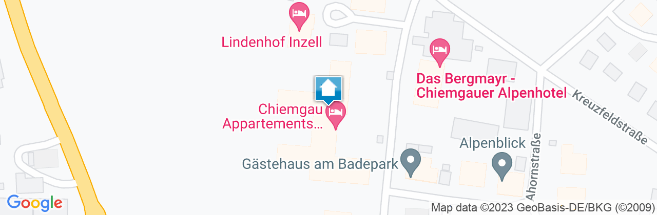 Autobahn München - Salzburg (A8) - Ausfahrt 112 Inzell bei km 99 - B 306 - 11 km nach Inzell - am Ortseingang rechts Richtung Ortmitte - nächste Straße links Richtung Badepark - am Badepark links in die Lärchenstraße