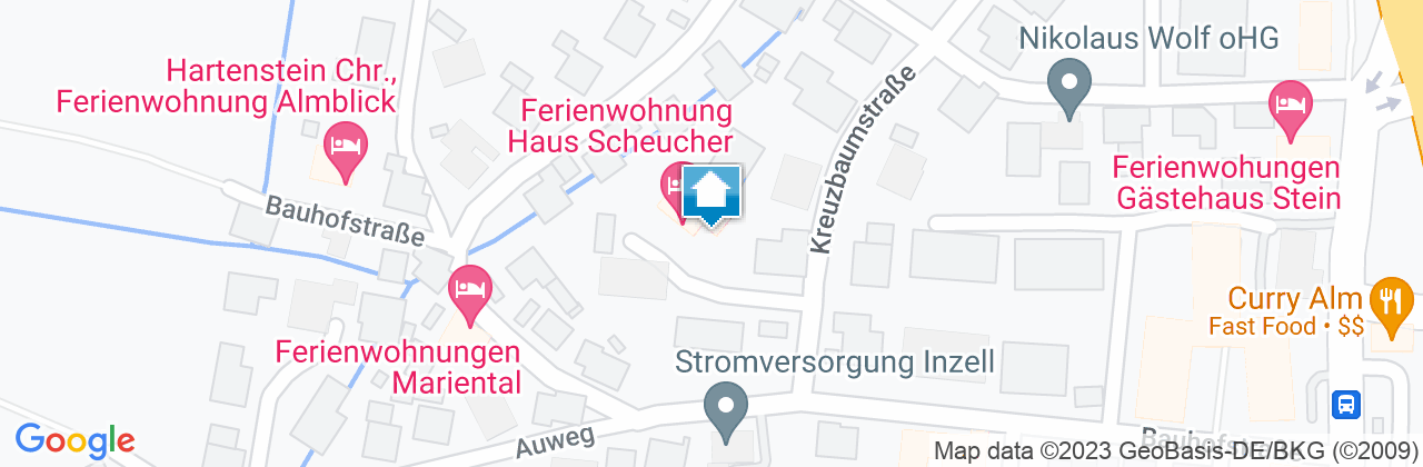 Autobahn München - Salzburg (A8) - Ausfahrt 112 Inzell bei km 99 - B 306 11 km nach Inzell - am Ortseingang rechts Richtung Ortsmitte - am Busbahnhof rechts in die Bauhofstraße - 1. Straße rechts in die Kreuzbaumstraße - nach 30m Stichstraße links.