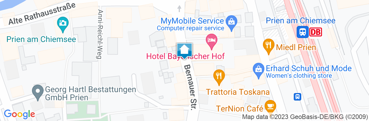 Lage: Im Ortszentrum in Mitten der Fussgängerzone von Prien gelegen, Nahe der DB- und Chiemsee-Bahnstation, 2 km zur Schifffahrt, Prienavera Erlebnisbad und Strandbad. Ausgangspunkt für Radtouren und Wanderungen. Ausstattung: Alle Zimmer mit Bad oder Dusche/WC, Haarfön, Kosmetikspiegel, Radio, Sat-Flat-TV, 3 Skyprogramme auf den Zimmern, Durchwahltelefon, Sitzecke, überwiegend mit Balkon. Zimmer auch mit Bergblick. Kostenlosem W-LAN Hotspot. Bayerische Gaststube "zum Sterzer". Hotelbar mit SkySport. Internet-Terminal an der Rezeption kostenlos. PKW Stellplätze (begrenzt), Tiefgarage (begrenzt), weitere Stellplätze in ca. 400 Metergeringer Entfernung. Besonderheit: Aussenterrasse-Biergarten, Bistro "Fletz" geöffnet von 10.00 bis 23.00 Uhr, Küche mit bayerischer regionaler und saisonaler Küche. Große Weinauswahl und verschiedene Biersorten. Sauna, Dachterrasse mit Liegestühlen und Lounge ohne Bewirtung. Gruppen willkommen. Konferenzräume bis 35 Personen vorhanden. Radfreundlich. Kinderermäßigung.