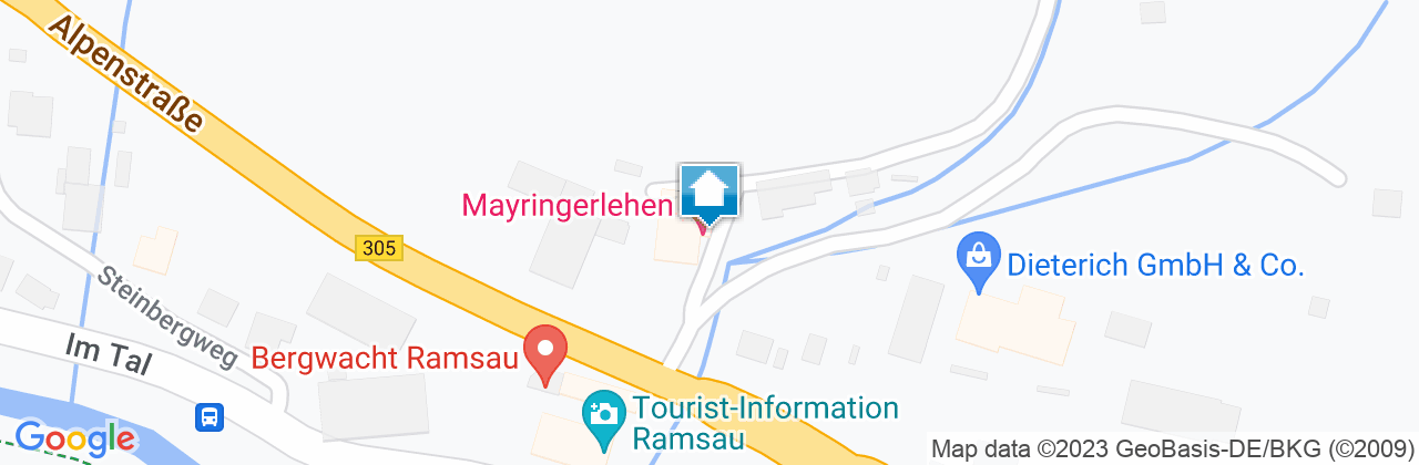 Autobahn A8 München- Salzburg bis Ausfahrt Siegsdorf/Traunstein, weiter auf der B306 Richtung Berchtesgaden, über Inzell, Weißbach bis Unterjettenberg, von dort auf der B305 über Gasthaus Wachterl bis Ramsau Zentrum. Vor der Ortseinfahrt (Tourist Information) links ist die Einfahrt Mayringerlehen.