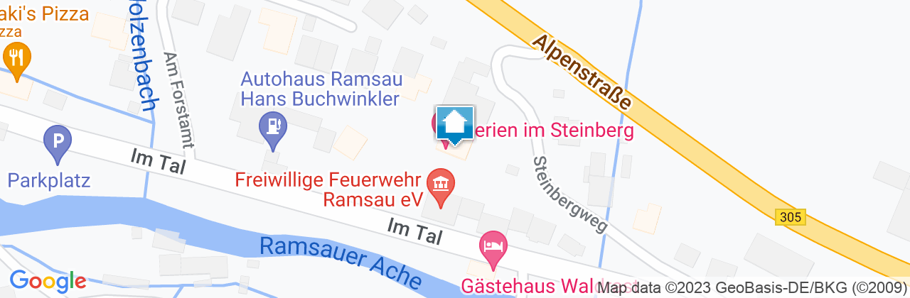 Freeway A8 Munich- Salzburg until exit Siegsdorf/Traunstein, continue on B306 direction Berchtesgaden, via Inzell, Weißbach until Unterjettenberg, from there on B305 via Gasthaus Wachterl and Gasthof Hindenburglinde until Ramsau center. Here turn right into the village, approx. 100m to Hotel Hochkalter, directly after that turn right into Steinbergweg and follow the road to house number 9.