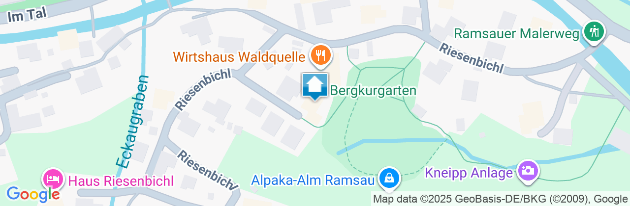 - Freeway (A8) Munich - Salzburg (approx. 100 km)- Motorway exit Inzell-Siegsdorf- Drive on the B306 in the direction of Inzell- From Inzell continue on the Alpenstraße (B305)- Via Weißbach - Schneizlreuth - Ramsau- From the Alpenstraße turn right onto the road "Im Tal".- Approx. 500 m after the tourist information turn left over a bridge to the street "Am Riesenbichl"- Straight ahead, past the inn "Waldqelle"- Turn left at the protestant church- At the end of the street "Am Bartmannfeld" you will find our house no. 5- Welcome!