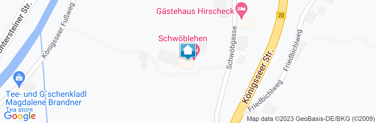 Sie erreichen über die A8 München-Salzburg kurz vor der Grenze Österreich die Ausfahrt Bad Reichenhall und folgen der B 20 nach Berchtesgaden. Bei Weiterfahrt über die Grenze (VIGNETTENPFLICHT!). Bei dem Kreisverkehr Bahnhof Berchtesgaden kommend Richtung Königssee, nehmen Sie die Abzweigung rechts Unterstein-Schönau und erreichen die Abzweigung Schwöbgasse in der nächsten Rechtskurve auf der linken Seitte. Nach ca. 100 Meter Hauszufahrt rechts.