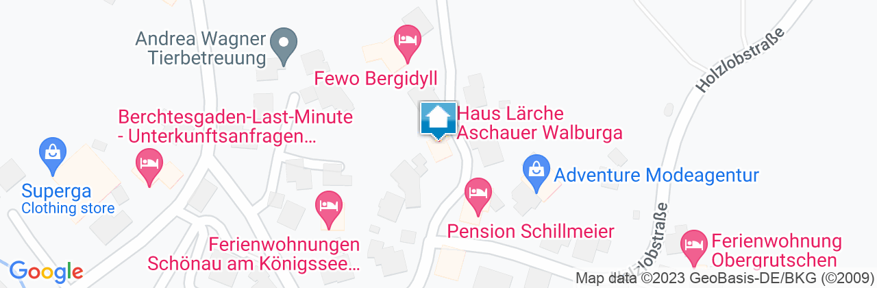 Sie fahren von der A8 München-Richtung Salzburg. Nehmen Sie die Ausfahrt Bad Reichenhall. Das ist die letzte Ausfahrt vor der österreichischen Grenze (bei Weiterfahrt VIGNETTENPFLICHT!). Von Bad Reichenhall auf der B20 den Schildern Richtung Berchtesgaden folgen. Sie durchfahren dabei die Ortschaften Bad Reichenhall, Bayerisch Gmain, Hallthurm und Bischofswiesen und kommen schließlich zum großen Kreisverkehr am Bahnhof Berchtesgaden. Nehmen Sie dort die Ausfahrt Richtung Königssee und folgen Sie der Königsseerstraße in Richtung Königssee. Biegen Sie nach ca. 1 km links in den Ortsteil Schwöb ab. Sie sind jetzt auf der Alten Königsseer Straße. Fahren Sie bis zur nächsten Abzweigung und biegen Sie dort links in die Richard-Voss-Straße ein und nach wenigen Metern nochmals links in die Holzlobstraße, dann geradeaus Richtung Eberbichlweg. Die Unterkunft befindet sich auf der linken Seite.
